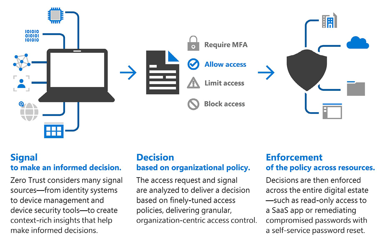 Pentru a implementa conceptul Zero Trust Security sunt necesare semnale pe baza cărora se vor lua deciziile și vor fi impuse constrângeri ce implementează aceste decizii. De exemplu, dacă utilizatorul se conectează din rețeaua internă este încadrat la un nivel de risc scăzut, ce se va transforma automat în nivel ridicat dacă dispozitivul folosește o rețea publică. La acest mod de stabilire a nivelului de risc pot însă contribui semnale diverse: locul dispozitivului, apartenența utilizatorului la grupuri stabilite pe criterii organizaționale, tipul aplicației accesate, tipul de validare al identității sau nivelul de îndeplinire al unor condiții impuse dispozitivului folosit: update-uri la zi, antivirus activ, versiunea sistemului de operare etc.