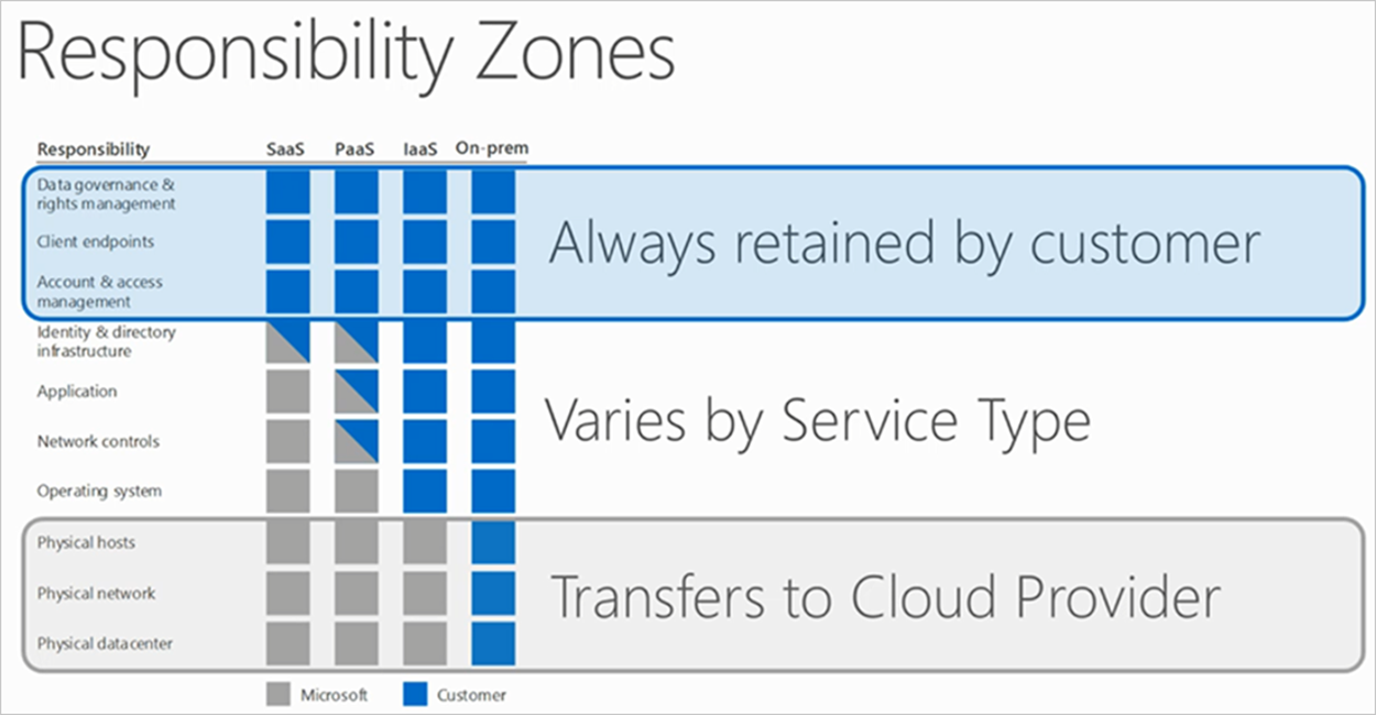 Modelul propus de Microsoft privind responsabilitatea implementării, controlului și administrării soluțiilor de securitate este unul partajat între vendor și client, numit Shared Responsibility Model și reprezentat mai jos: