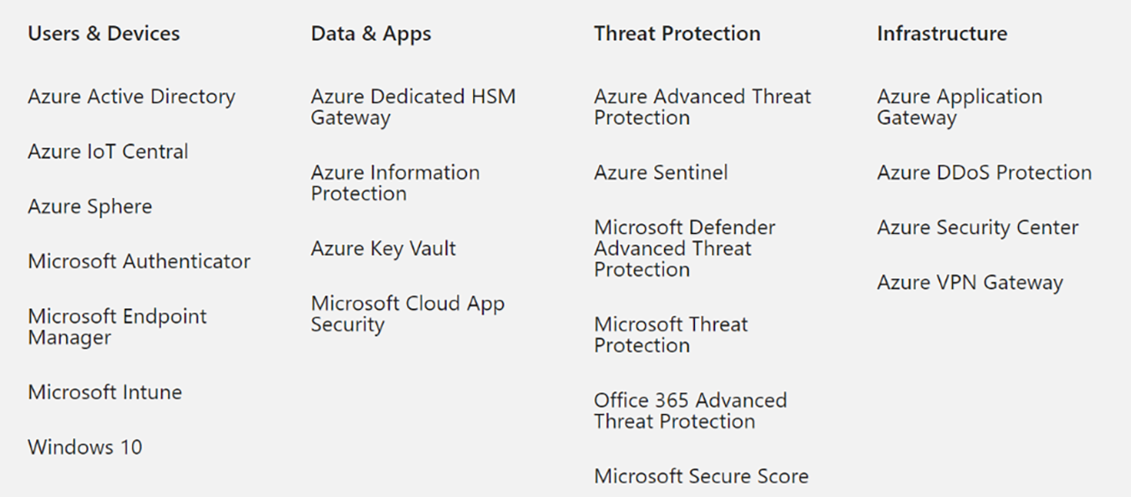 Deși domeniul securității în cloud este unul foarte ridicat, în cele ce urmează se vor trece în revistă cele mai importante tehnologii pe care Microsoft le integrează cu platformele de cloud sau le oferă ca servicii complementare contra-cost companiilor ce vor să-și securizeze infrastructurile interne sau serviciile găzduite în platformele cloud Microsoft 365 și Azure.