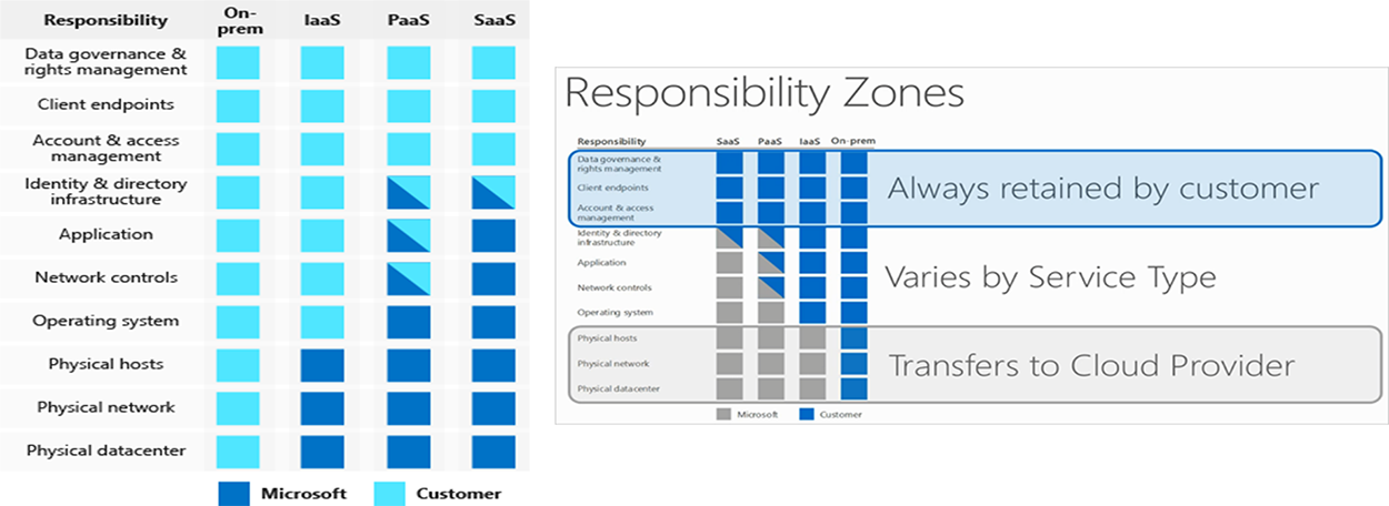 La o soluție Software as a Service, ca Microsoft 365, responsabilitatea vendorului Microsoft include și platforma de aplicație și controlul mediului de rețea (endpointurile sunt predefinite), responsabilitatea comună fiind doar pe zona platformei de identity. Indiferent însă de model, organizația va fi întotdeauna responsabilă pentru definirea conturilor de acces, a parolelor, protecția datelor personale și implementarea mecanismelor de governance, gestionarea accesului și activarea licențelor asociate utilizatorilor.