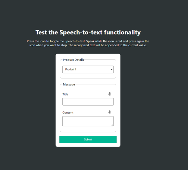Pentru acest capitol este folosit ca exemplu următorul caz: un formular simplu, unde utilizatorul poate introduce informațiile atât folosind tastatura cât și dictând conținutul în engleză.