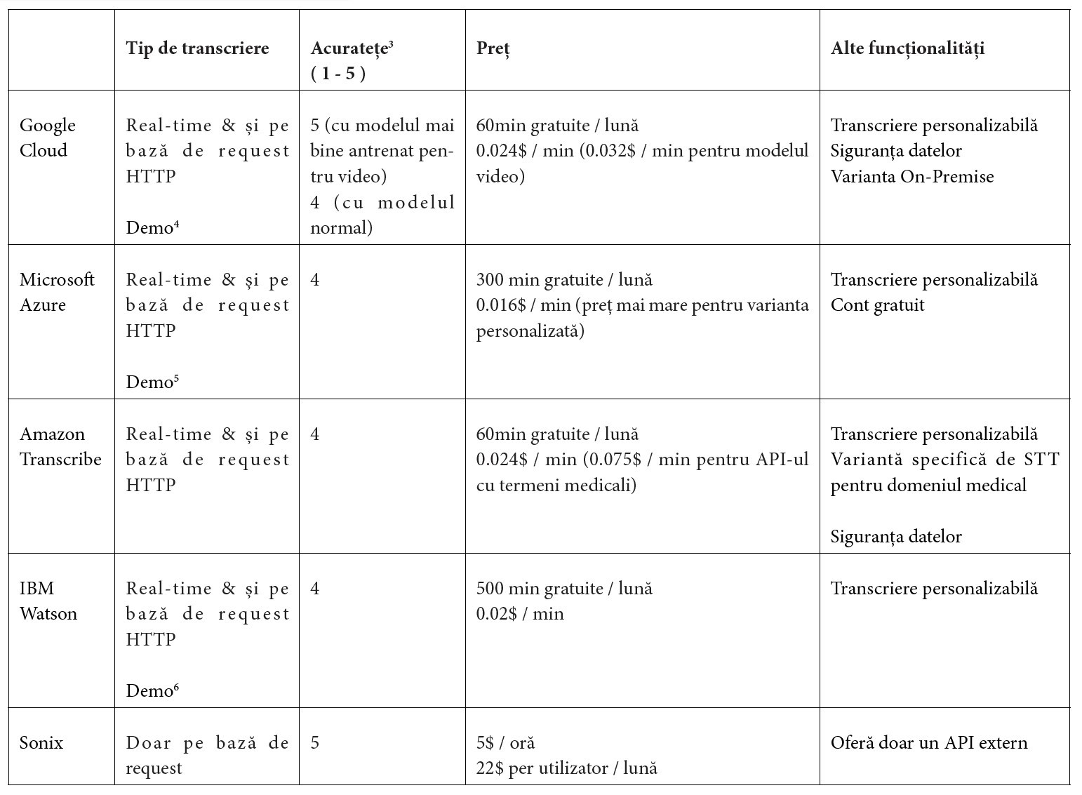 Tabelul de mai jos reprezintă unele dintre cele mai populare soluții cloud care oferă opțiuni de transcriere a vocii în text. Tabelul conține și câteva metrici relevante pentru fiecare soluție.