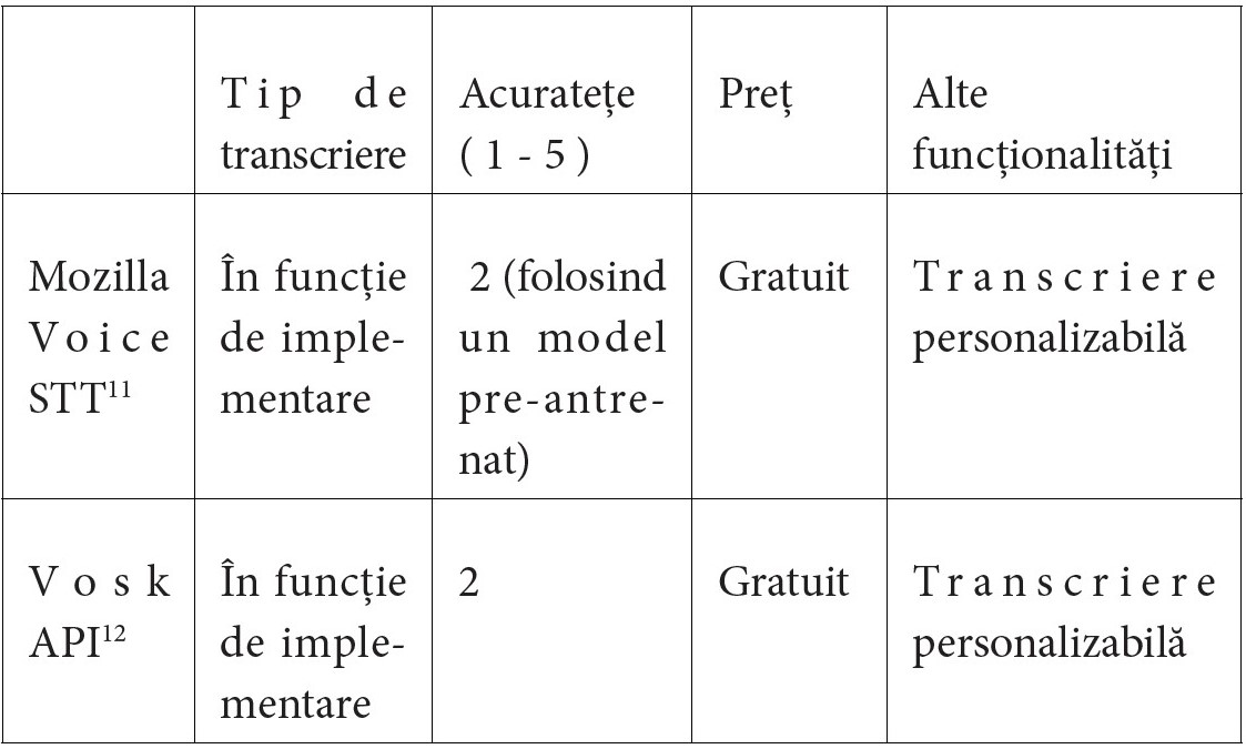 Analiza soluțiilor Speech-to-text disponibile este realizată doar pentru soluțiile disponibile pentru aplicații Web (soluțiile desktop cum ar fi Dragon Professional nu sunt analizate) și pentru soluții care oferă posibilitatea transcrierii mai multor limbi (Rev nu este analizat deoarece oferă doar limba engleză).