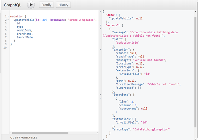 La cel mai înalt nivel, graphql-java-servlet expune o metodă (numită isClientError) care decide dacă mesajul unei erori va fi trimis clientului textual sau dacă va fi ascuns de un mesaj de eroare generic al serverului. În mod implicit, numai erorile sintactice și de validare vor fi trimise așa cum sunt. Aceasta este o valoare implicită rezonabilă, deoarece mesajele de excepție pot dezvălui o mulțime de informații care, în mod normal, ar trebui ascunse vizualizării publice. Cu toate acestea, mesajele de eroare neinformative (sau chiar prea multe mesaje) pot avea un impact negativ sever asupra utilizabilității API-ului.