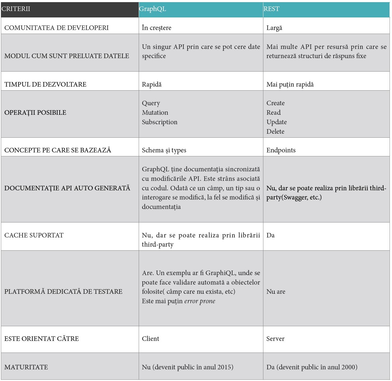 Utilizarea API-urilor a cunoscut o creștere extraordinară. Pe măsură ce aplicațiile mobile și web au devenit mai populare, a existat o nevoie evidentă de a deconecta backendul aplicației de la front-end. Adevărul este că API-urile sunt acum prezente în majoritatea software-urilor dezvoltate în zilele noastre. Această utilizare pe scară largă a API-urilor a arătat, de asemenea, câteva dezavantaje ale modului în care API-urile au fost construite și consumate, ceea ce a generat inovații precum REST și GraphQL. În cadrul companiei noastre avem proiecte cu GraphQL, unde implementarea a avut succes și nu au fost showstoppers din punct de vedere tehnic.