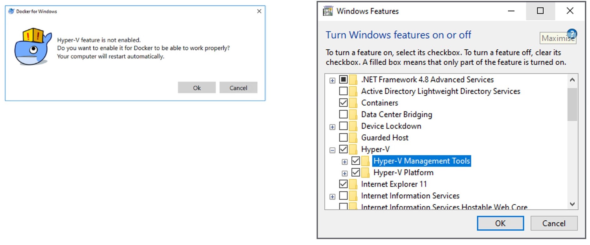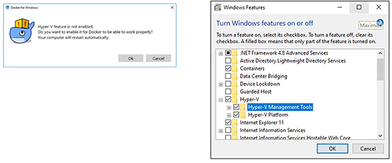 După ce ați instalat Docker CE pentru Windows, el putându-se instala gratuit de la linkul de mai jos, aplicația pornind imediat după instalare. Pentru a rula Docker este necesar ca Hyper-V să fie activat, lucru care se poate face din Windows Features.