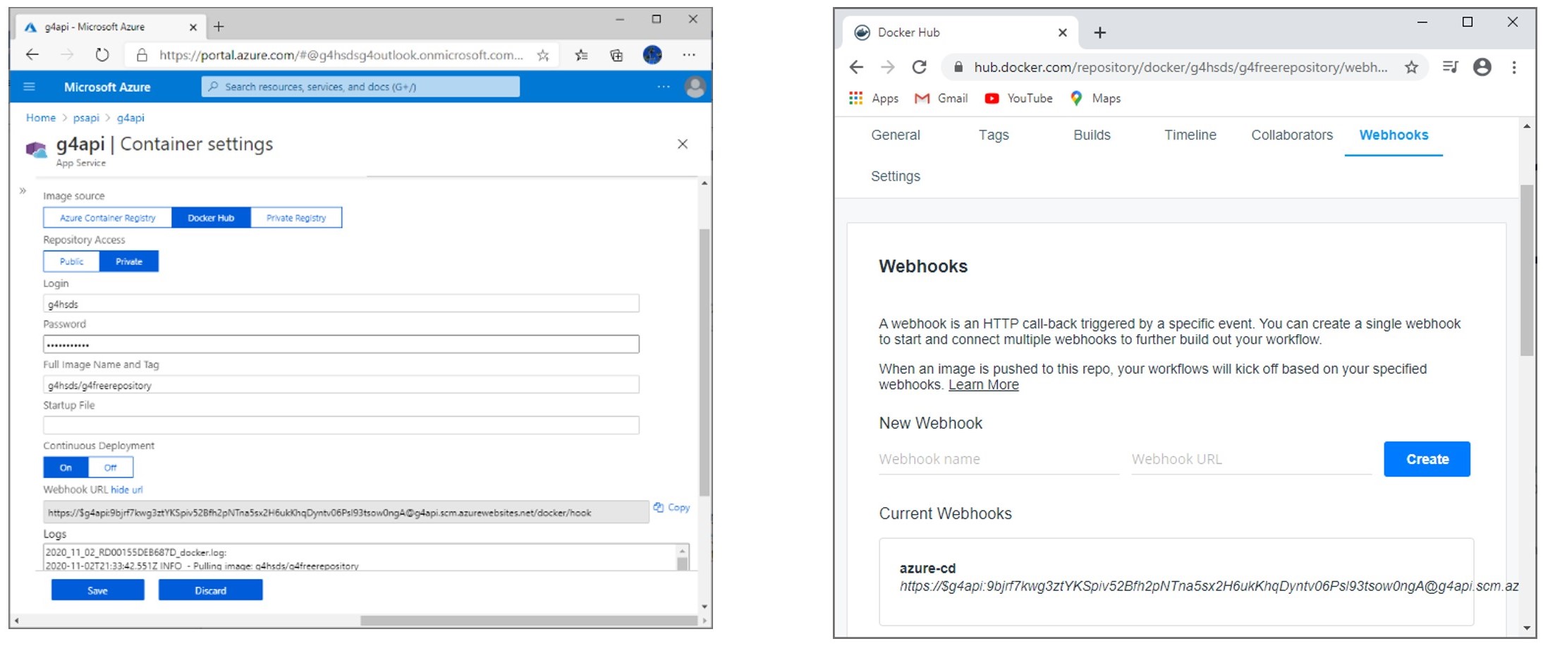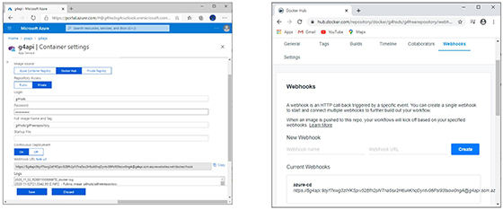 Putem configura acum și continuous deployment. Această operație ne ajută atunci când vom publica o nouă imagine în Docker Hub. Azure va fi notificat și își va lua imaginea automat din Docker hub, nemaifiind necesară o altă intervenție în Azure la fiecare modificare/republicare a imaginii, va fi destul doar să o republicăm în Docker hub. Pentru aceasta, copiem Webhooks URL din Docker hub în Container settings din Azure: