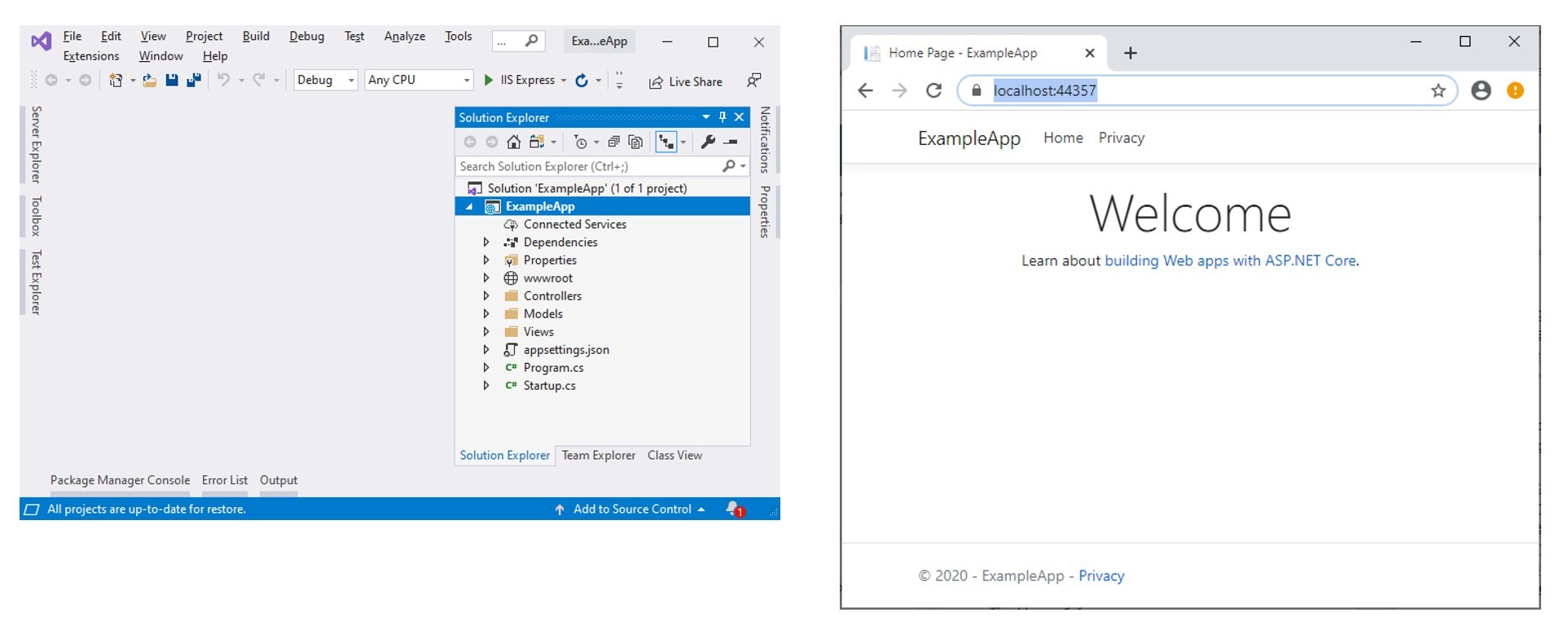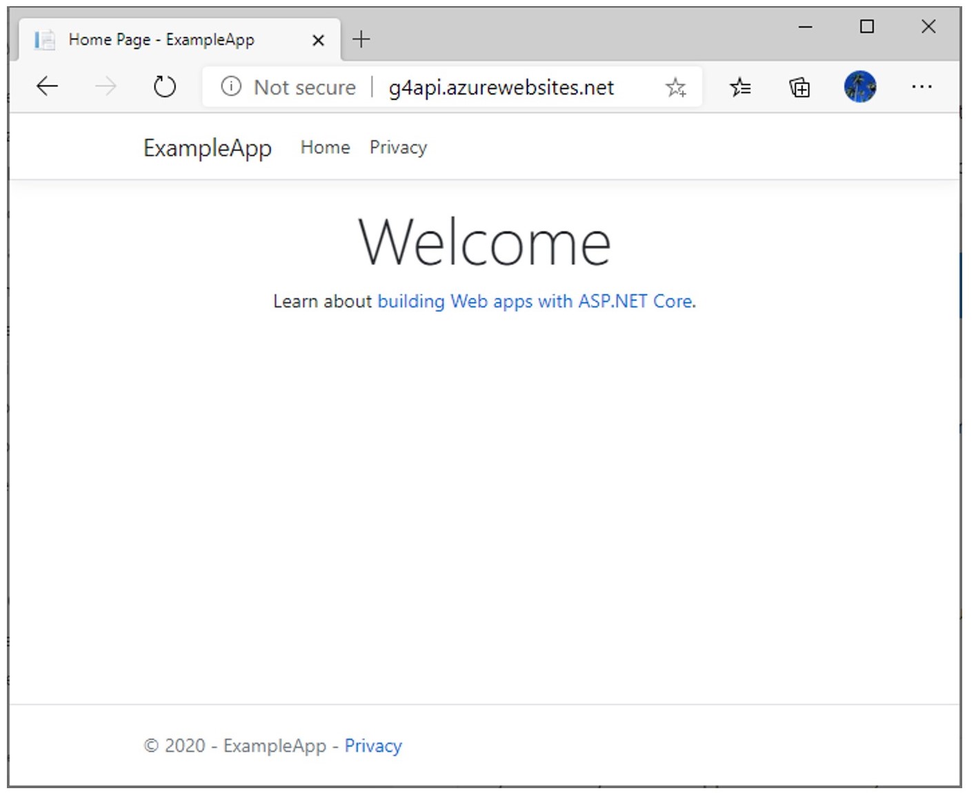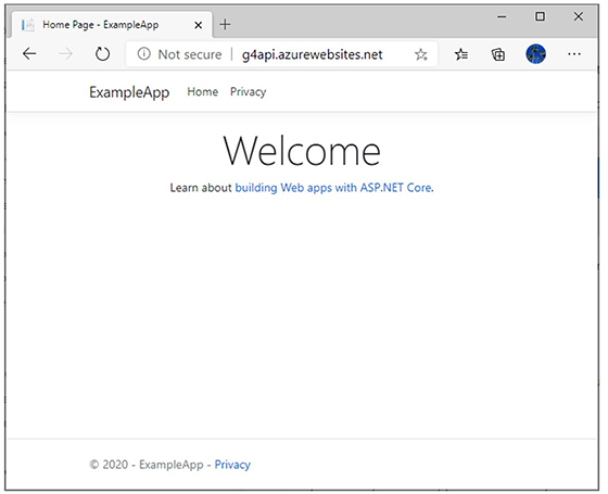 Navigați în folderul ExampleApp și apelând la ExampleApp.csproj puteți deschide aplicația MVC în Visual Studio, pe care, dacă o executați (meniul Debug-Run), ar trebui să obțineți ceva asemănător cu imaginea de mai jos, ceea ce înseamnă că aplicația s-a creat și rulează cu succes: