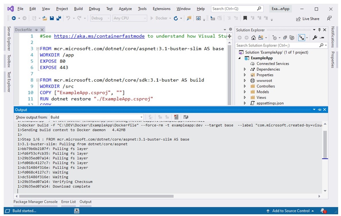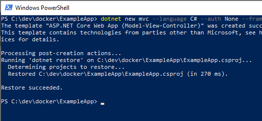 Trebuie să aveți instalat .Net core SDK, Docker CE și Visual Studio 2019 Community Edition și, de asemenea, aveți nevoie de cont în DockerHub și Azure. Pentru început vom crea o aplicație Asp.Net core MVC. Pentru aceasta, am creat un folder cu numele ExampleApp, apoi din linia de comandă din consola PowerShell scriem: