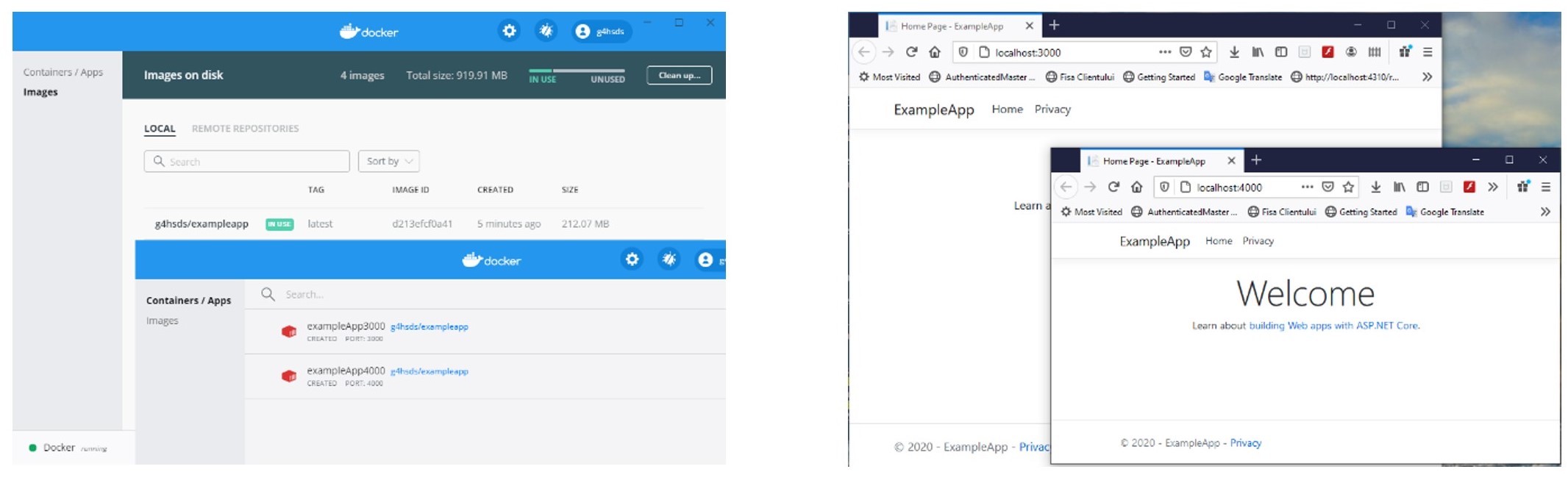 Vom șterge, însă, acum din Docker imaginea și containerul create automat atunci când am rulat aplicația, apoi, le vom recrea din linia de comandă. Pentru a înțelege cum se creează imaginile și containerele folosind linia de comandă din folderul ExampleApp, rulați următoarele comenzi în consolă, în urma cărora se vor crea imaginea cu aplicația și două containere pe baza ei, -p fiind o mapare a portului 80 din containere la portul 3000 respectiv, 4000 din sistemul host, iar -t este tagul asociat cu imaginea, o convenție fiind ca eticheta să fie de forma CompanyName/AppName: