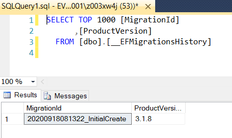 Tabela __EFMigrationsHistory cu migrarea InitialCreate din baza de date nouă trebuie să o importăm în baza de date existentă. Pentru acest exemplu, SQL Server Management Studio a fost folosit și la importarea tabelei.
