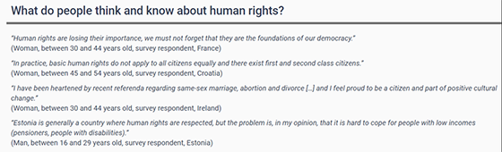 Atunci când i s-a prezentat la sondaj afirmația negativă "Drepturile omului sunt lipsite de sens pentru mine în viața de zi cu zi", una din cinci persoane din UE a spus că "sunt de acord" sau "tind să fiu de acord" . În România 33% din respondenți au fost de acord sau au manifestat tendința de a fi de acord. Cel mai mic procent de oameni care sunt de acord sau au tendința de a fi de acord cu afirmația de mai sus se găsește în Cipru (7%), Malta (10%), Portugalia, Spania și Suedia (14% în fiecare).