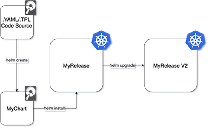 Simplitatea lui HELM devine evidentă în momentul în care ne uităm la conceptele cheie și la parcursul unui micro-serviciu în contextul HELM. Conceptele despre care vorbesc sunt HELM Chart, HELM Config si HELM Release. Un Chart conține informațiile necesare pentru a crea o aplicație kubernetes; un Config conține informații adiționale despre Chart și comportamentul acestuia; un Release le combină pe cele două menționate anterior pentru a instala aplicația în contextul kubernetes.