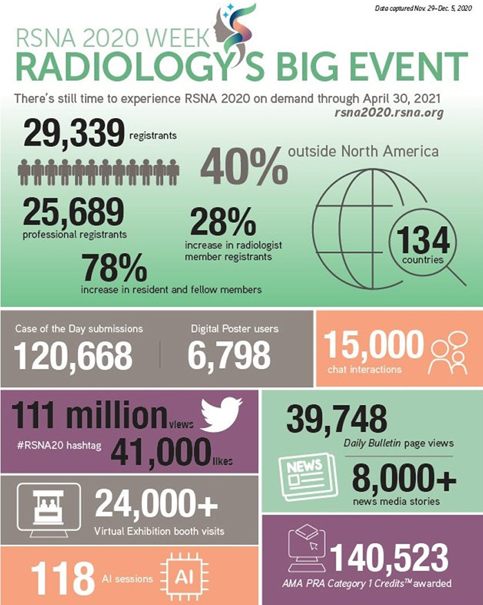În fiecare an, Societatea Nord Americană de Radiologie (Radiology Society of North America - RSNA) organizează o conferință în care radiologi, cercetători, specialiști IT și reprezentanți ai companiilor se întâlnesc pentru a-și împărtăși ultimele descoperiri și pentru a găsi soluții la problemele cu care se confruntă. Din cauza pandemiei, conferința din 2020 (29 noiembrie - 5 decembrie) s-a desfășurat în întregime online ceea ce ne-a permis mie și colegiilor mei să participăm, din confortul propriei case, la prezentări, fie live, fie înregistrare, ale cercetătorilor în domeniul imagisticii medicale din toată lumea.