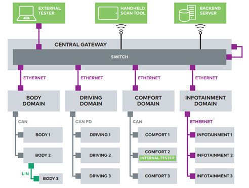 Acest tester este conectat la un central gateway, care poate avea la bază implementat protocolul "Diagnostic over IP", fundamentat pe standardul ISO 13400. Unul dintre principalele roluri ale protocolului DoIP este de a ruta mesajele trimise de către tester la un anumit ECU.