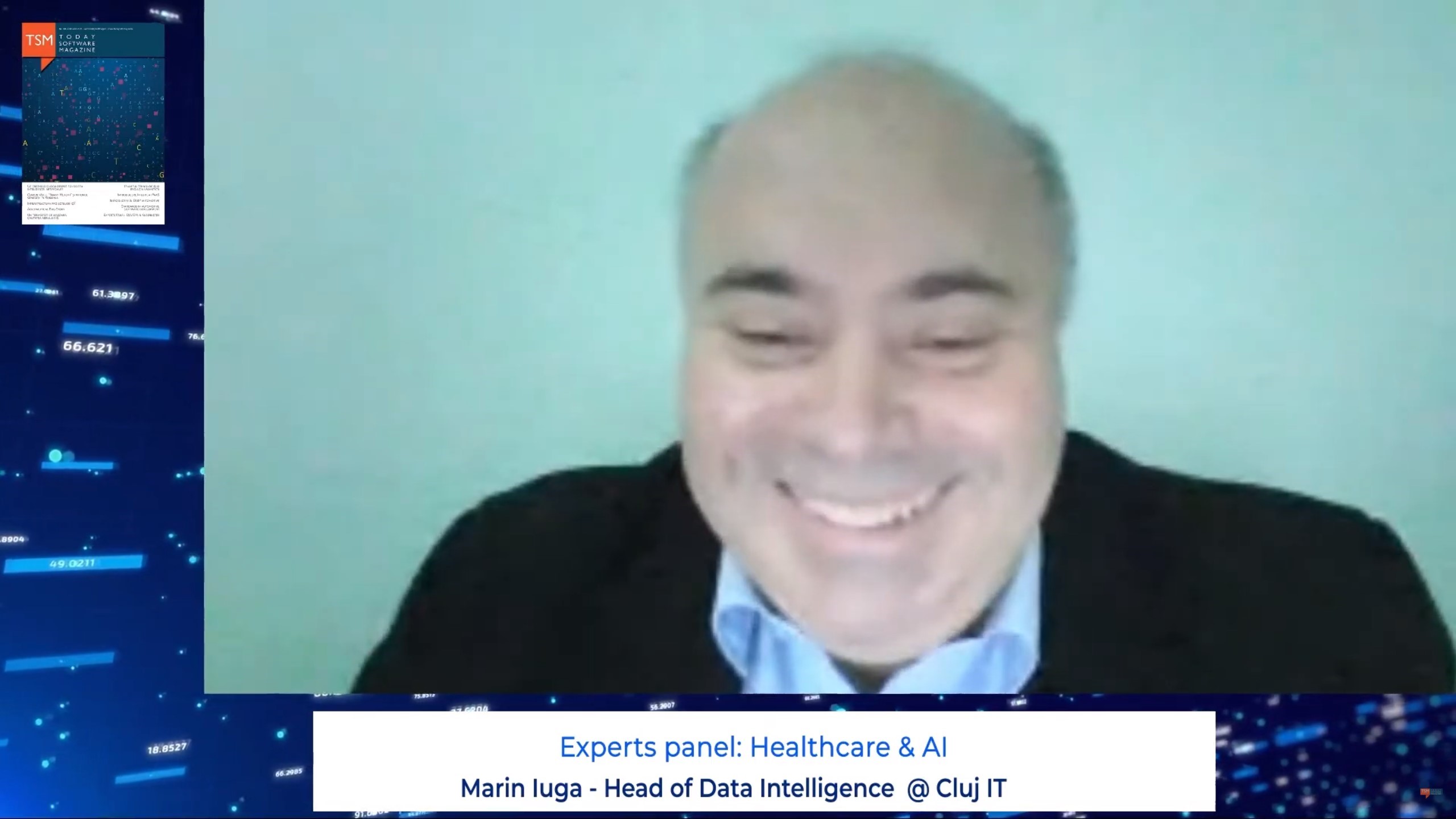 Marin Iuga: Am fost implicat în proiecte din domeniul imagistic pentru recunoașterea anomaliilor, a bolilor. Acestea sunt cele mai frecvente proiecte în medicină, dar eu aș dori să vă vorbesc de ceva nou. Un prim aspect ține de accesul la date. Pentru orice investitor, cea mai importantă investiție trebuie să fie cea în date, nu în algoritmi, nu în infrastructură. Datele care sunt complete, clare, variate creează premisa succesului în 80% dintre cazuri. Uniunea Europeană va crea în viitor așa-numitele "spații de date" printre care există și spațiul de date pe zona medicală. Se vor pune la dispoziția startup-urilor, a cercetătorilor, a industriilor date care sunt curated (adică bine adnotate, consistente) în scopul accelerării investițiilor. Dacă sunteți curioși puteți căuta European Data Governance Act care va fi votat în formă finală, undeva în septembrie anul acesta. Grupul de Data Intelligence a făcut amendamente la acest Act. Al doilea aspect despre care doresc să vorbesc se referă la alte domenii diferite de imagistică și medical records unde se aplică AI. Ar fi vorba de trei tendințe sau domenii de interes. Una dintre tendințe este Automated Drug Discovery. De exemplu, un vaccin are nevoie de zece ani pentru a fi cercetat cu adevărat. Prin modele probabilistice, prin simulare, prin automatizarea activităților de laborator se ajunge la reducerea timpului undeva la 2-3 ani, motiv pentru care avem acum vaccinuri puse pe piață într-un interval așa de scurt. O altă tendință este realizarea de sisteme chatbot. Se dorește folosirea interfețelor conversaționale nu doar în scop de diagnostic, ci și în zona de tratament curativ, de triaj, de asistență a bolnavilor și nu numai. A treia tendință este personalizarea completă a actului medical, AI intermediind tot procesul de la partea administrativă la cea curativă a actului medical, astfel încât fiecare pacient să aibă o experiență personală. În general, când vorbim de ROI la AI vorbim de trei paliere majore: palierul descriptiv (acesta nu e propriu-zis AI, dar e important pentru business analysis, data science unde vezi care sunt parametrii afacerii tale), palierul predictiv (acesta răspunde la întrebarea "Ce se va întâmpla în viitor?", un nivel matur, dar care deocamdată este considerat doar acceptabil ca nivel de ROI), palierul prescriptiv (care răspunde la chestiuni legate de optimizarea procesului de business). În AI, banii merg în două zone mari: robotică și optimiziarea proceselor de business. ROI se obține cu precădere din palierul prescriptiv.