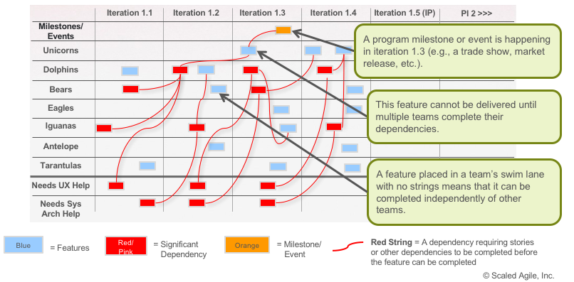 Program Board: este un board cu toate echipele și toate sprinturile. La început de PI acest board este gol, iar la final va fi populat cu toate feature-urile planificate de fiecare echipă pe sprinturi precum și dependențele identificate între feature-uri.
