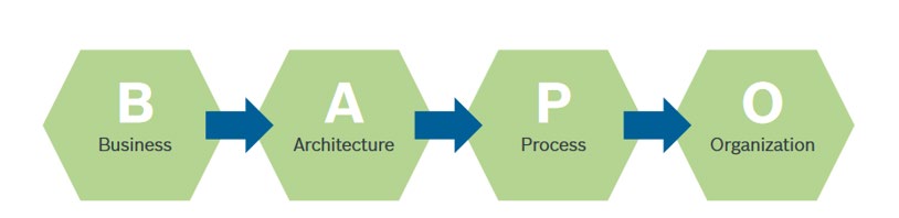 Am decis să folosim modelul BAPO care ne-a permis să ne orientăm mai bine. BAPO este un acronim compus din Business (afacere), Architecture (arhitectură), Process (proces) și Organization (organizație).