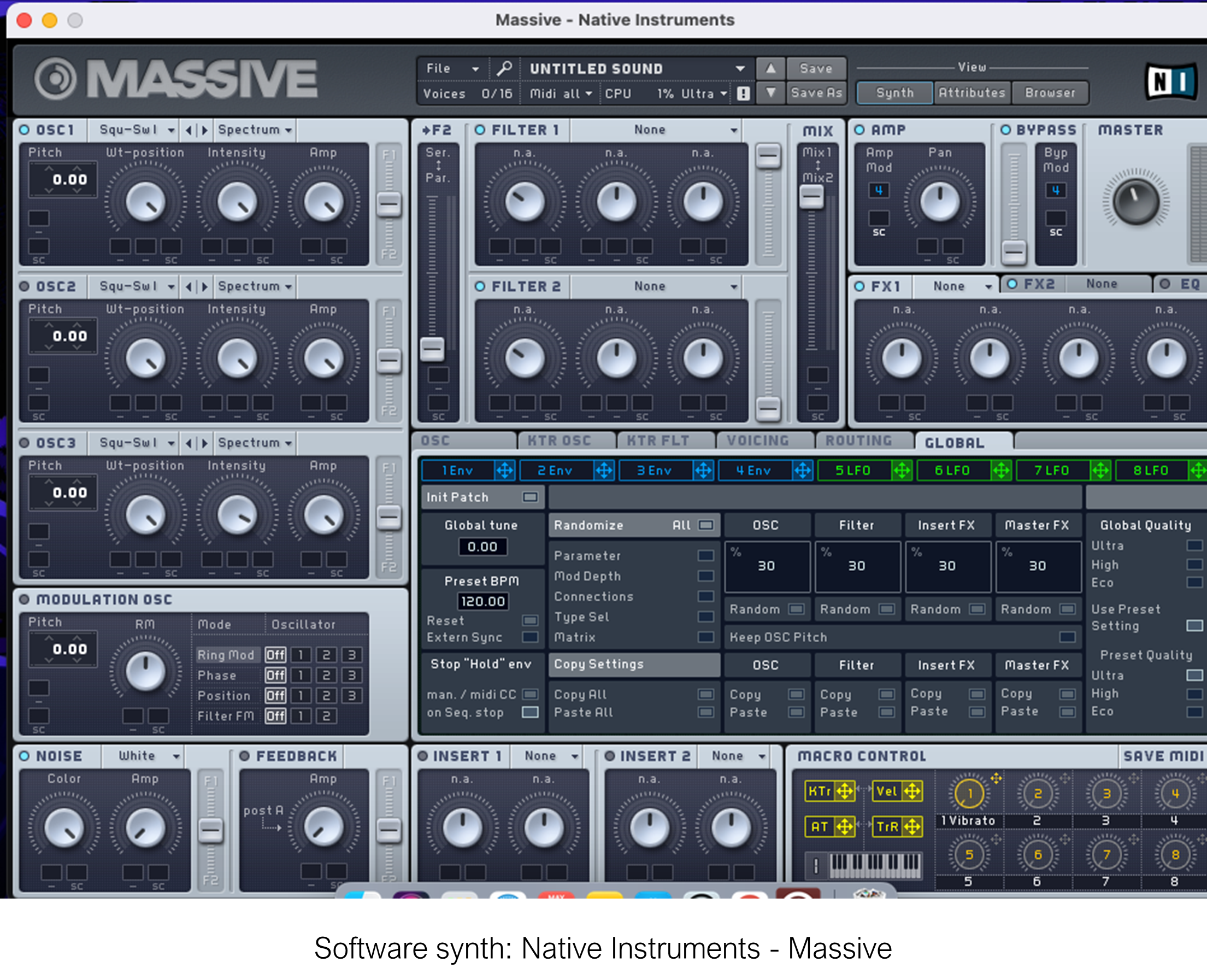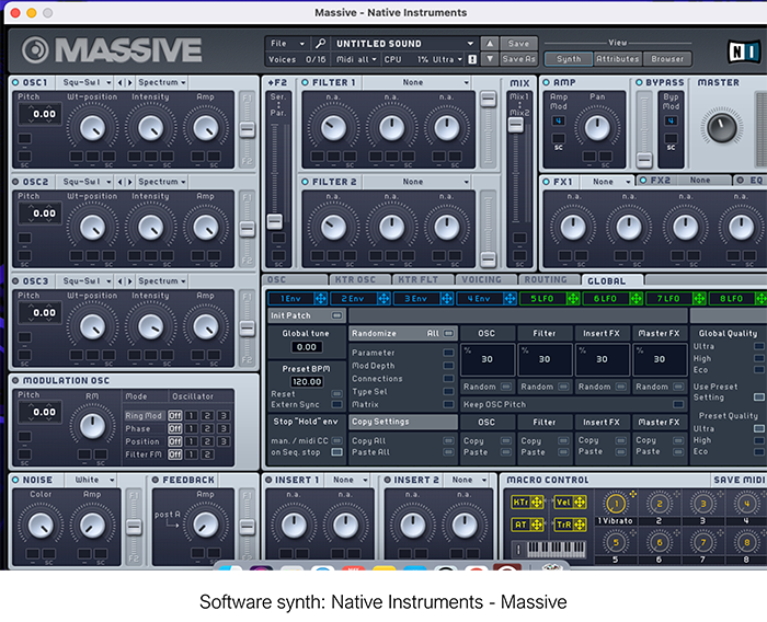 Massive este un software synth, deci un generator de sunet, nu foarte diferit conceptual de vechiul SID, deși principiile de sintetizare sunt diferite (wavetable comparat cu subtractiv, pentru discuție). După cum se vede în imagine, oferă trei oscilatoare + un generator de noise, filtre și efecte sonore. O claviatură electronică sau alt sistem de control poate fi atașată la desktop sau laptop și va permite controlul diverselor knoburi prin intermediul protocolului MIDI.