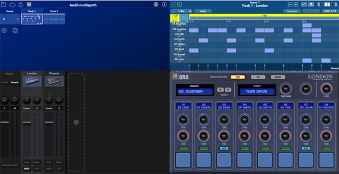 În imagine, două sintetizatoare sunt disponibile pentru percuție și claviaturi. În partea dreapta sus, sunt înregistrate "notele" iar în stânga jos sunt parametrii de control ADSR (vezi Terminologie), filtrele etc. disponibile pentru synthul respectiv.