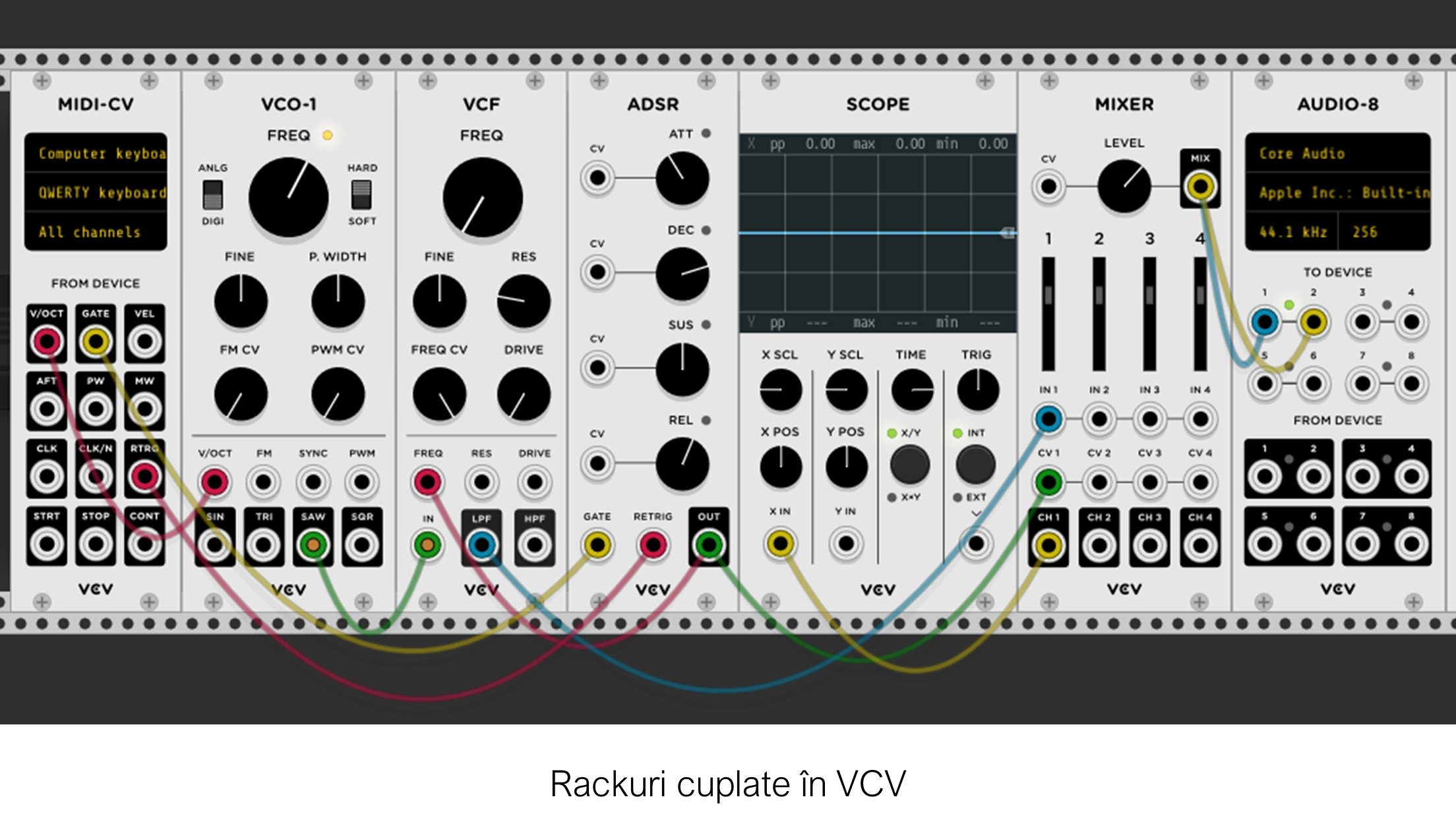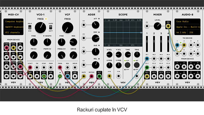 În imagine, semnalul MIDI e generat de la tastatură (un nivel de "voltaj" corespunzând unei note) și transmis de modulul MIDI-CV pentru procesare ulterioară în modulele generatoare de frecvențe, mixat, vizualizat în modulul "osciloscop" și redat sonor de modulul audio.