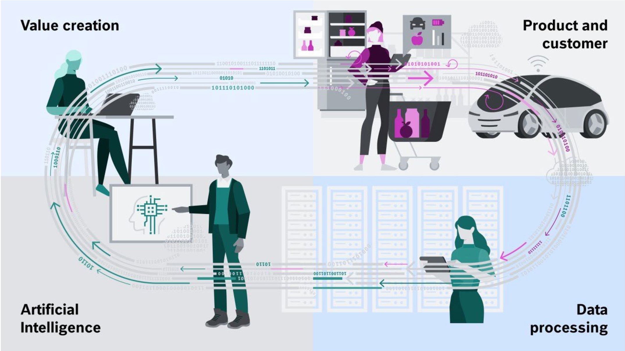 Adăugând IA la internetul lucrurilor, creăm o buclă închisă de creare de valoare ce poate fi automatizată. Procesul este mai rapid, ne permite să fim mai agili și să ne axăm mai mult pe utilizator. Forța motrice a acestui ciclu este crearea valorii de business, pe baza unui flux constant de date. Datele sunt forța vitală a businessului.
