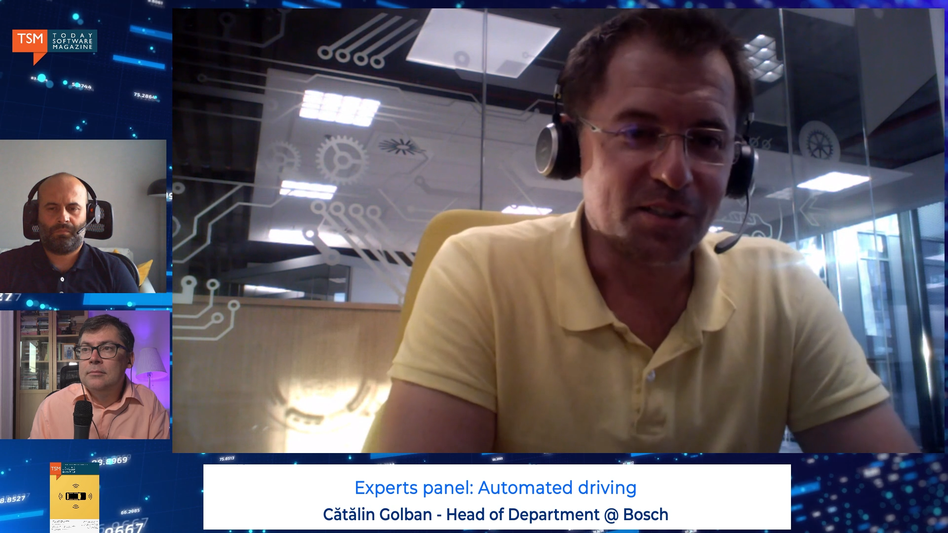 Cătălin Golban: Există patru nivele de automatizare. La Bosch Cluj lucrăm foarte bine cu nivelul 2 pe care îl avem în producție, dar și cu nivele 3 și 4. Nivelul 3 presupune funcționalități ce implică prezența șoferului și sistemul care deține controlul în trafic. Dar, trebuie menționat că șoferul trebuie să intervină la prima notificare că este ceva în neregulă. Nivelul 3 este mai important din punctul de vedere al businessului, deoarece implică tehnologii scalabile pentru volume mari de mașini și mașinile de serie. Ne ocupăm și de tehnologiile de nivel 4 care presupune tehnologii mult mai scumpe pentru un număr restrâns de mașini de tip robo taxi sau automated shuttles unde nu vorbim de volume mari de astfel de vehicule, ci de sisteme punctual instalate în anumite spații bine delimitate. Noi acționăm în partea de percepție, adică a algoritmicii semnalelor de orice tip și în construirea unor reprezentări de nivel mai înalt pe baza cărora se face controlul mașinii, adică accelerație, frânare, virare, semnalizare și alte activități specifice în condiții de trafic.