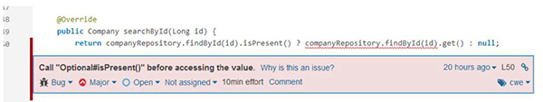 Instrumentul este foarte prietenos în a diagnostica și ghida programatorul în remedierea problemei detectate, după cum se poate observa și în Figura 1: localizare în cod, mesaj sugestiv, posibilitatea de a oferi informații suplimentare, timp estimat de remediere, tip și severitate.