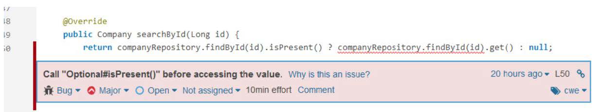 Figura 1: Identificarea și localizarea unei probleme de cod în SonarQube