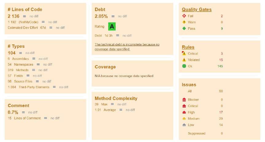 NDepend folosește aceeași scală SQALE precum SonarQube, între A și E, iar raportul generat, precum exemplul din Figura 4, cuprinde informații sumative referitoare la dimensiunea proiectului și la defectele detectate.