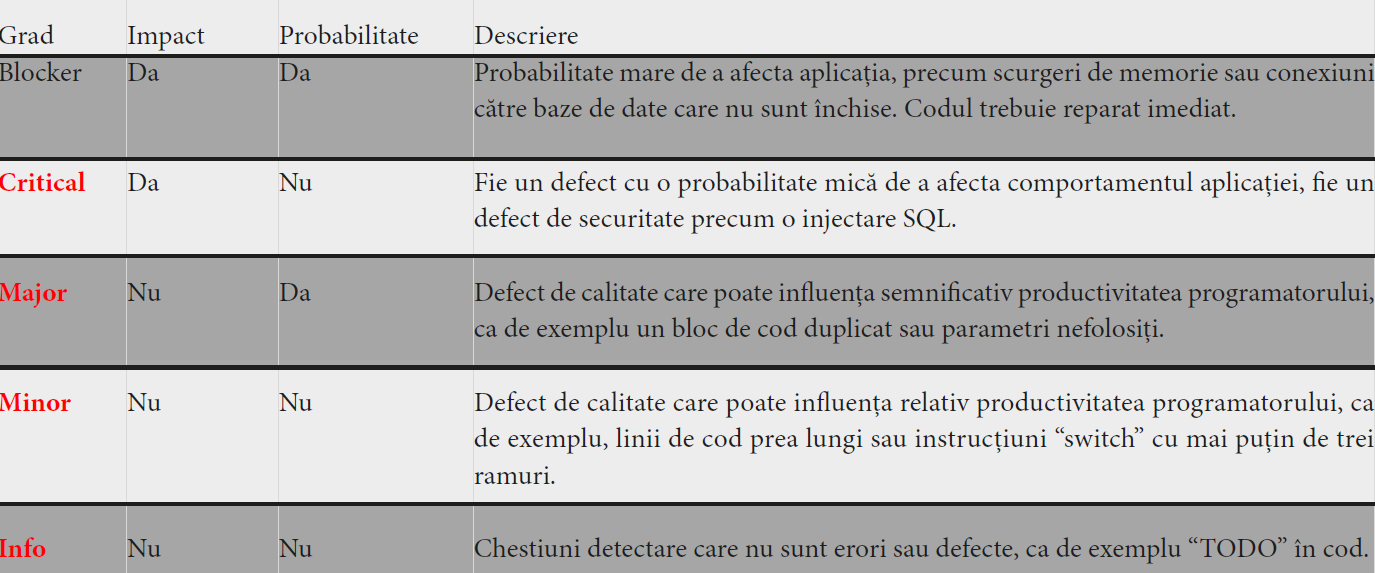 Tabel 1: Gradele de severitate asociate regulilor, conform documentației SonarQube [1]