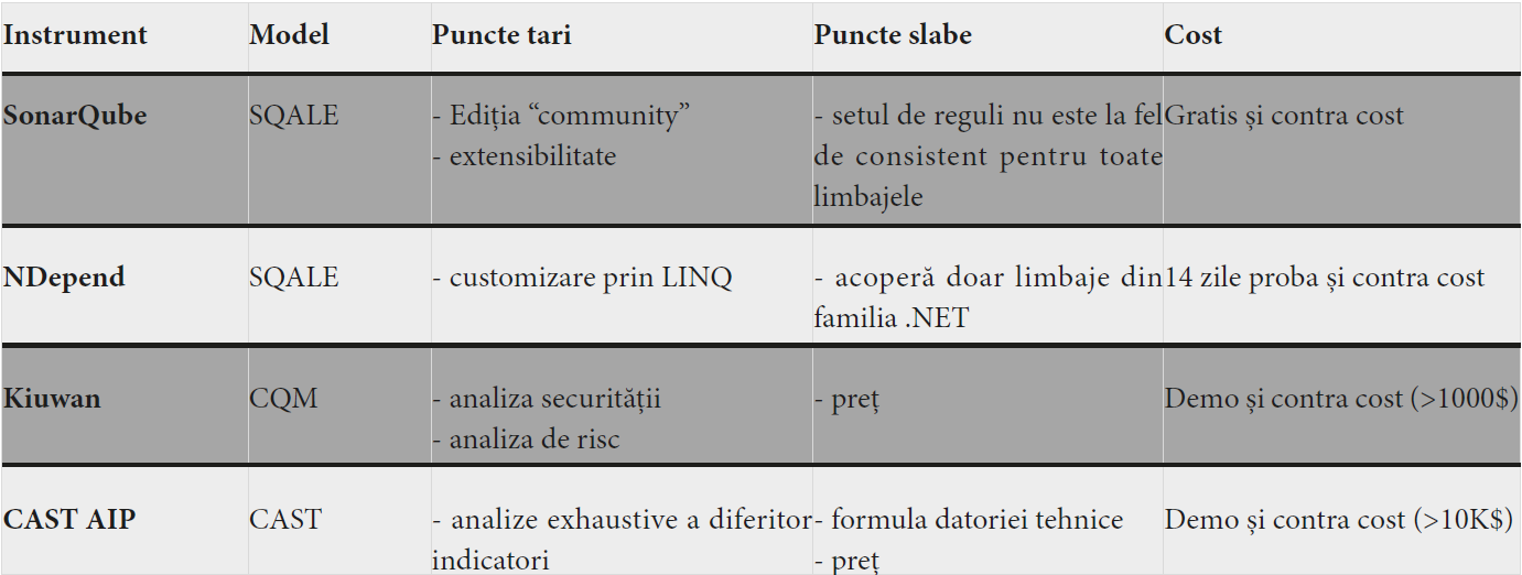 Tabelul 2: Comparația principalelor instrumente de estimare a datoriei tehnice