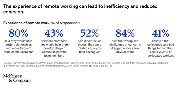 E normal să știm și ce pierdem: interacțiunea umană față în față; zgomotul de fond, atât de necesar, formal și informal prin care ne creștem nivelul cunoștințelor atât pe plan profesional cât și pe plan personal; eficiența în meetinguri, facilitatorii trebuind să-și facă upgrade-uri masive la tehnici pentru a se apropia cât de cât de eficiența ședințelor față în față; ne expunem la mai puține idei și chiar la mai puține critici constructive atât de necesare pentru a găsi soluțiile cele mai bune.