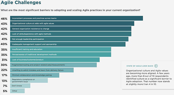 Același studiu ne poartă din nou printre provocările și barierele adoptării Agile: