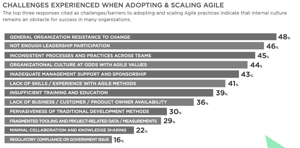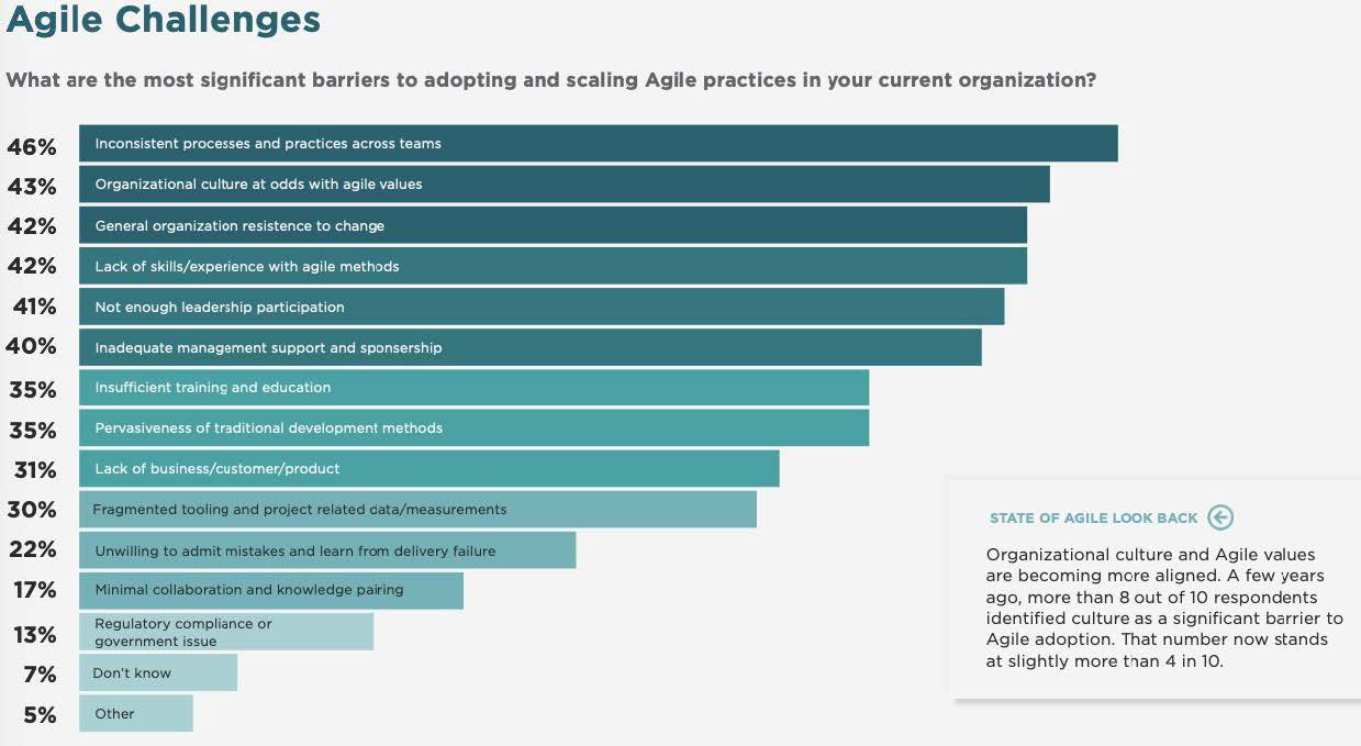 În 2020, al 14-lea State of Agile Report3 menționa printre provocările cele mai mari în adopția mindsetului Agile, despre care povesteam la început că se bazează extrem de mult pe colaborare, regăsim: