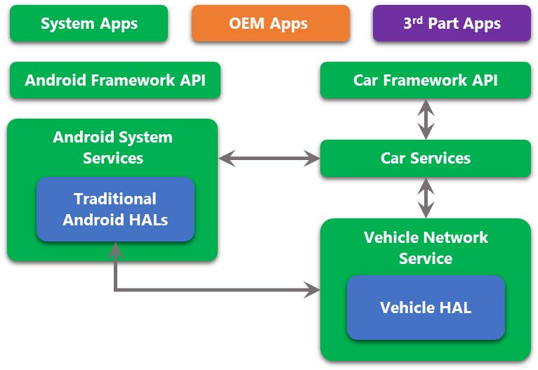 Ca soluție, Google a introdus în arhitectura Android următoarele componente specifice Automotive: