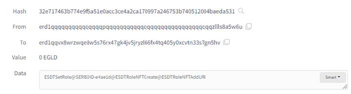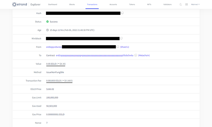 Aceasta este frumusețea tehnologiei blockchain. Totul este transparent dar confidențial. Aș fi putut crea un nou portofel fără a oferi vreo informație personală acestui Blockchain, folosindu-l pentru a genera NFT-uri anonim. Totuși, acele criptomonede 0.05 Egold trebuie să vină de undeva și pot fi urmărite până la ultima zecimală, din portofel în portofel, de la swap contracts până la lichidități. Adresele hașurate cu albastru din tranzacția de mai sus sunt inutile pentru oricine vrea să verifice colecțiile de NFT-uri emise recent (mai ales că data și ora apar în tranzacție). Rezultatul apelului ne va oferi Id-ul colecției de tokenuri pe care îl vom folosi pentru a emite NFT-uri: