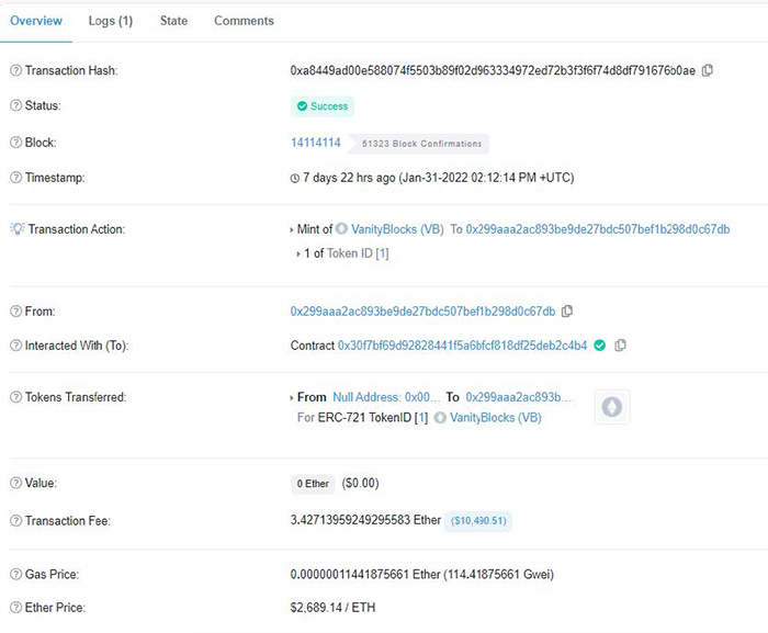 Ne aflăm la pasul 3: stocarea adreselor IPFS ale amintirilor noastre în blockchain pentru a avea dovada de proprietate în portofelul nostru digital. Pentru aceasta, avem nevoie de un Blockchain care oferă suport pentru NFT-uri. Cum Ethereum a definit primul protocol NFT în 2017, acesta ar fi prima alegere, deoarece la ora actuală este cel mai descentralizat și sigur Blockchain ce permite rularea smart contracts. Totuși, tranzacțiile pe ETH nu sunt deloc ieftine din cauza algoritmului de consens folosit (proof of work). Dacă considerați că sunt zgârcit, verificați tranzacția ETH de mai jos, de acum câteva zile în care s-a "mintat" un NFT cu un cost de 3.42 ETH și care la momentul la care scriu articolul se apropie de 14.000 USD. Veți înțelege ideea.