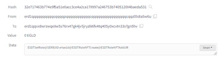 NFT-urile sunt lansate sau oferite sub formă de colecție, deoarece execuția unui smart contract care creează și gestionează o colecție este o operație costisitoare. De obicei, mii de NFT-uri sunt generate într-o singură colecție, fiind gestionate de un smart contract care suportă cereri de generare a NFT-urilor ("minting") pentru o sumă de criptomonede preconfigurată în contract. Proprietarul contractului redirecționează apoi suma colectată de smart contract către portofelul lui. Mintingul este doar un cuvânt sofisticat pentru acționarea mânerului de la slot machine care îți returnează aleatoriu unul dintre NFT-uri rămase neasignate în contract, printr-o tranzacție al cărei destinatar este portofelul celui care face apelul sau solicitarea. Majoritatea smart contracts NFT sunt implementate în limbajul Solidity creat special pentru Ethereum blockchain. Un exemplu de smart contract pe modelul jocurilor electronice scris în Rust pentru Elrond blockchain creat de Julian Ćwirko puteți găsi pe github. Scopul nostru este ca NFT-urile ce reprezintă identitatea noastră digitală să ajungă în portofelul nostru digital, nu suntem așadar interesați de minting, iar pentru aceasta e suficient să ne asignăm nouă toate NFT-urile din colecție, fără să le vindem aleatoriu. Pentru etapa 2, ne vom oferi (portofelului nostru digital) rolul de a genera NFT-uri pentru această colecție. În acest scop, vom apela scriptul set_nft_special_role.sh cu parametrul collection ID extras din tranzacția de mai sus. Datele arată astfel: