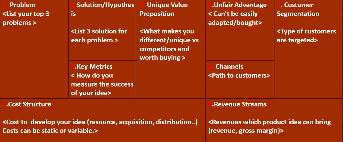 Este un document de business de o pagină unde puteți organiza/planifica ideea voastră de produs folosind blocuri logice ce vă vor ajuta să asociați niște zone/puncte cheie pentru a obține o înțelegere mai clară, mai ușoară a ceea ce doriți să obțineți.
