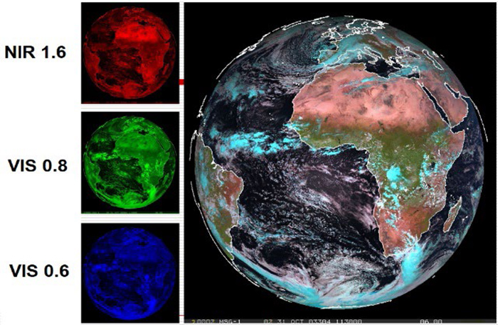Canalele folosite pentru obținerea acestei imagini sunt canalul în NIR 1.6, canalul VIS 0.8 și canalul VIS 0.6. Imaginea RGB "Culori naturale" poate fi foarte utilă pentru a face deosebirea între norii formați din picături de apă, cei formați din cristale de gheață și stratul de zăpadă. Se pot recunoaște o varietate de structuri ale solului incluzând vegetația, deșertul și zăpada. Oceanul apare negru datorită reflectanței reduse în toate canalele. O altă aplicație provine de la canalul în infraroșu apropiat care are absorbție diferită pentru apă și gheață ceea ce ne permite să facem deosebirea între norii formați din cristale de gheață și cei formați din picături de apă și între norii formați din picături de apă și zăpadă. Un exemplu este prezentat în Figura 13.
