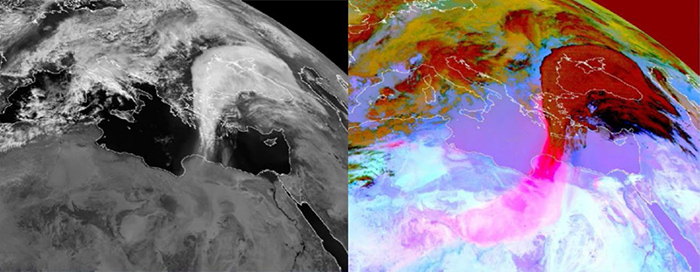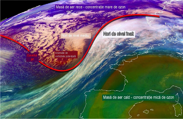 Concentrația ozonului total (înălțimea tropopauzei) aproximată de diferența temperaturii de strălucire dintre canalul 9.7μm (canalul în ozon) și canalul în infraroșu 10.8μm ne ajută să facem diferența dintre masele de aer polar, bogate în ozon, și masele de aer (sub) tropical, sărace în ozon. În masele de aer polar, bogate în ozon, diferența temperaturii de strălucire va fi mare. În masele de aer tropical, cu o tropopauză înaltă și cu concentrație redusă de ozon, diferența temperaturii de strălucire va fi mică. În final, conținutul de umezeală de la nivelurile înalte, furnizat de către temperatura de strălucire a canalului în vapori de apă 6.2μm este arătat pe albastru. Culoarea roșiatică este o indicație a aerului stratosferic care pătrunde în jos, în troposferă și, astfel, coboară tropopauza. Aceasta este o anomalie de vorticitate potențială. Putem, de asemenea, recunoaște curentul jet. În partea ciclonică a curentului jet există mișcări descendente, iar în partea anticiclonică, mișcări ascendente. Aerul descendent apare ca o dungă roșiatică în imaginea RGB a maselor de aer. Frontul rece, arătat de către norii înalți, marchează zona de separație dintre două mase de aer de origine diferită. Putem vedea nuanțe de verde la sud-est și nuanțe de albastru la vest și nord-vest de sistem. Nuanțele de verde sugerează tropopauză înaltă, ozon puțin și mase de aer cald, tropicale. Nuanțele de albastru și mov sugerează tropopauză joasă, ozon mult și mase de aer rece, polare.