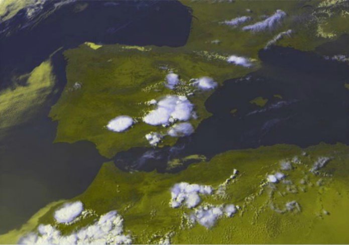 Fig. 15. Imagine Meteosat 8 RGB în vizibil de înaltă rezoluție - 28 iunie 2004 - 16:00 UTC [1] cirrus care apar în nuanțe de albastru.