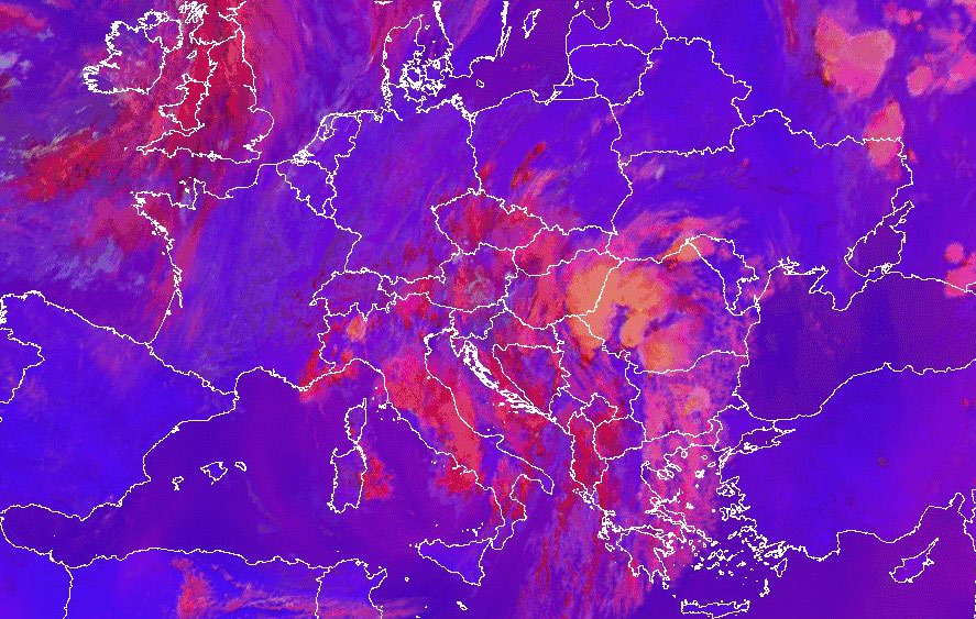 Fig. 17. Imagine Meteosat 8 (RGB pentru monitorizarea furtunilor convective severe) - 19.06.2016 ora 19 UTC [2]