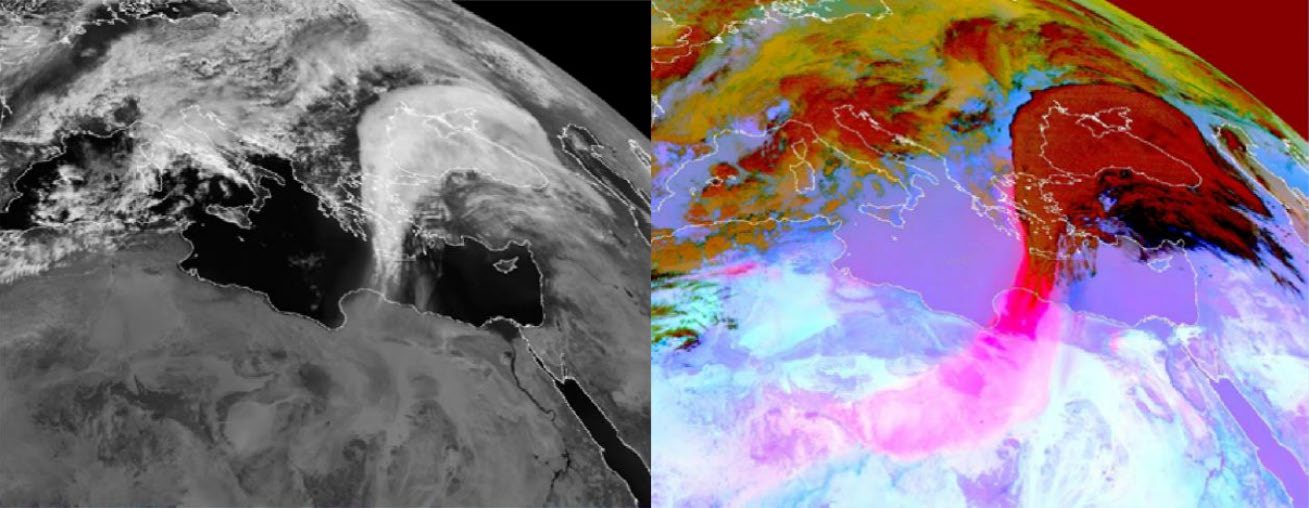 În imaginea RGB pentru monitorizarea prafului, praful poate fi văzut clar datorită nuanțelor de roz intens. Putem vedea că mari cantități de praf au fost antrenate într-un sistem noros aparținând unei benzi transportoare calde, care se întinde din zona Insulei Creta până deasupra Mării Negre. De asemenea, poate fi observat cu ușurință praful de deasupra deșertului Sahara, care nu ar fi putut fi observat doar din imaginea în VIS 0.6. Praful devine atât de clar deoarece diferențele temperaturilor de strălucire sunt diferite pentru praf și pentru norii formați din picături de apă sau din cristale de gheață. Folosind diferențele dintre canale, aceste caracteristici sunt evidențiate, iar praful devine ușor de recunoscut. Avantajul acestei metode este aceea că poate fi folosită chiar și noaptea.