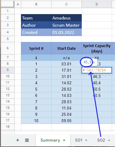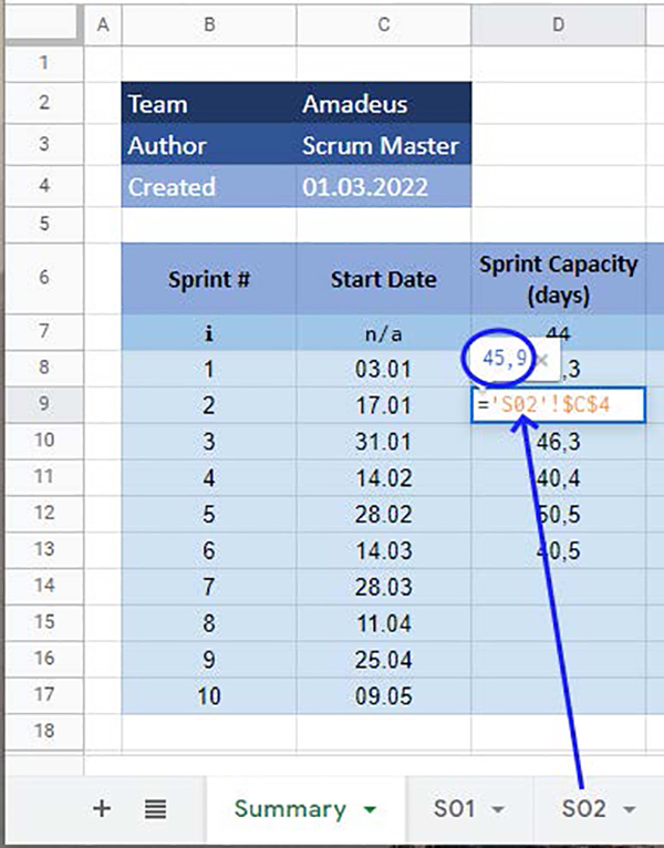 Pentru a avea o imagine clară, de ansamblu a tuturor sprinturilor trebuie să vă concentrați sprinturile într-un tabel sumativ (Overview Sheet). Pentru a realiza acest lucru, trebuie să enumerați pe o coloană toate sprinturile, iar apoi, pentru fiecare sprint trebuie să menționați capacitatea calculată (în fiecare fișă de calcul).
