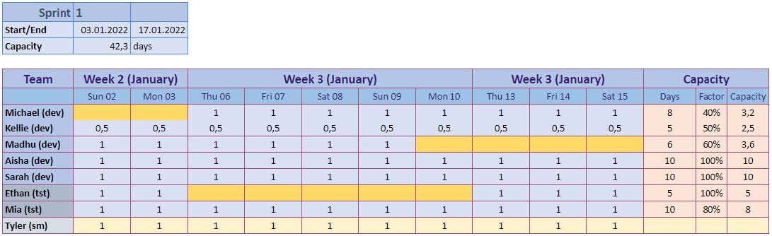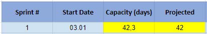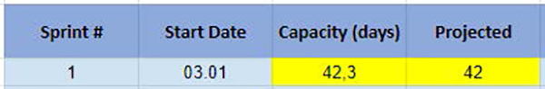 Capacitatea sprintului (Sprint Capacity) reprezintă numărul total de zile lucrătoare ale membrilor echipei: programatori sau programatori și QA, dacă doriți să includeți QA în calcularea capacității.