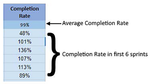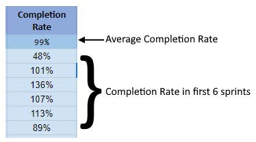 Procentul de finalizare a sarcinilor de lucru (Completion Rate) reprezintă procentual cât de mult a livrat echipa comparativ cu velocitatea estimată, ideală. Procent de finalizare = Velocitate livrată / Velocitate estimată.
