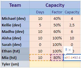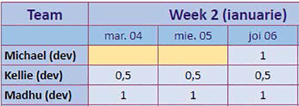 Echipa voastră nu este o entitate fixă. Unii membri pot să nu fie 100% disponibili în cadrul unei echipe. Dacă un membru lucrează cu jumătate de normă, 4 ore din 8, puteți evidenția acest lucru foarte simplu: capacitatea voastră zilnică nu este 1, ci (e.g.) ½., sau pot lucra în cadrul echipei de luni până miercuri, iar săptămâna următoare de joi până vineri etc.