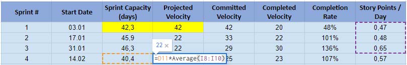 Pentru următoarele sprinturi, velocitatea estimată va fi egală cu capacitatea sprintului înmulțită cu media Story Points per zi din sprinturile anterioare.